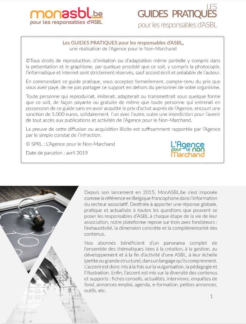 Un guide pratique est un document de plusieurs dizaines de pages qui a pour objectif d'informer de manière simple et pratico-pratique les ASBL sur une problématique bien spécifique. Vulgarisation, pédagogie et illustration sont les mots d'ordre de cet ouvrage.