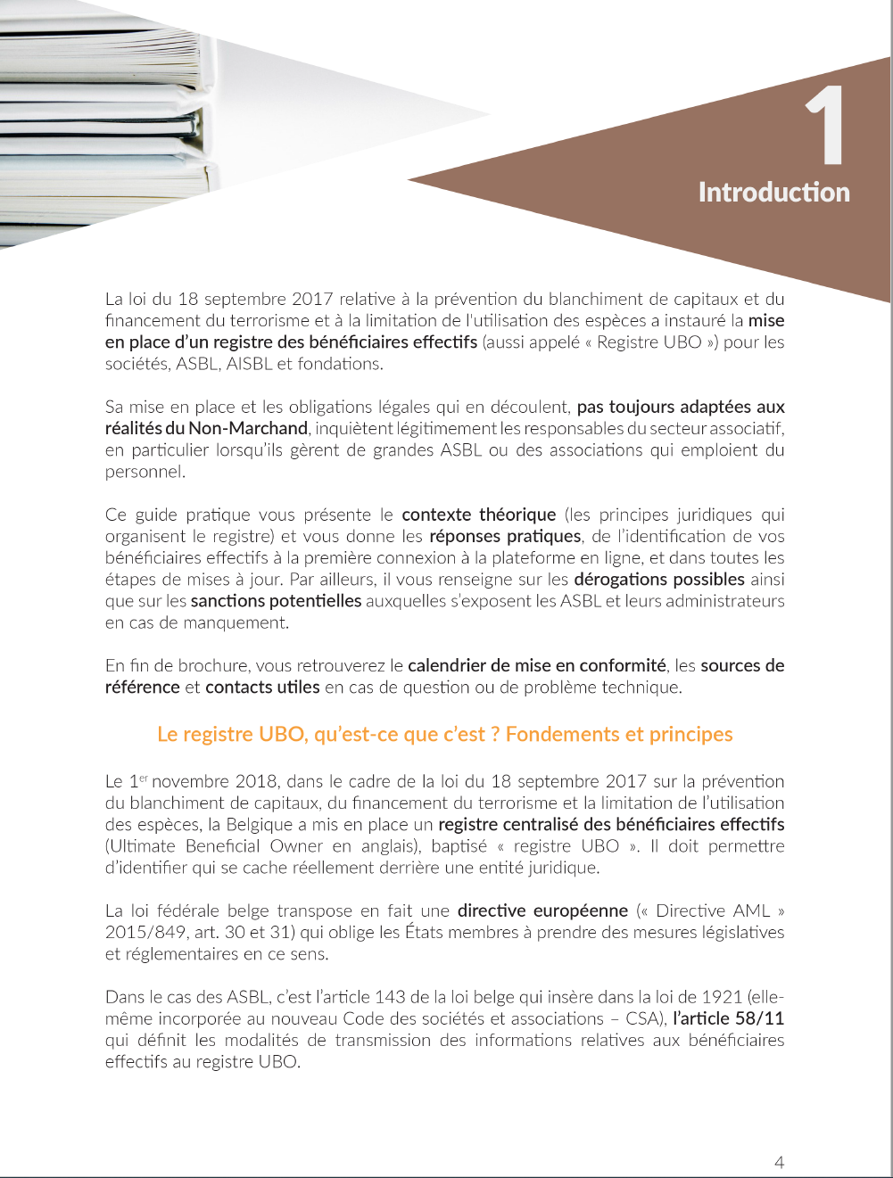 La loi du 18 septembre 2017 relative à la prévention du blanchiment de capitaux et du financement du terrorisme et à la limitation de l'utilisation des espèces a instauré la mise en place d'un registre des bénéficiaireseffectifs (aussi appelé «Registre UBO») pour les sociétés, ASBL, AISBL et fondations.