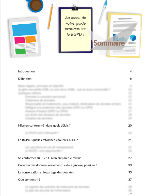 Avec l'entrée en vigueur du RGPD, comme les entreprises, les ASBL doivent démontrer leur maîtrise des données à caractère personnel qu'elles traitent dans le cadre de leurs activités et missions. Ce guide pratique vous accompagne dans la mise en place d'une politique de gestion et de protection sans entraîner de gouffre de temps et d'argent pour votre structure.