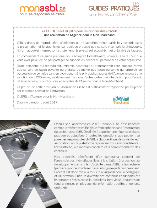 Un guide pratique est un document digital de plusieurs dizaines de pages qui a pour objectif d'informer de manière simple et pratico-pratique les ASBL sur une problématique bien spécifique. Vulgarisation, pédagogie et illustration sont les mots d'ordre de cet ouvrage.